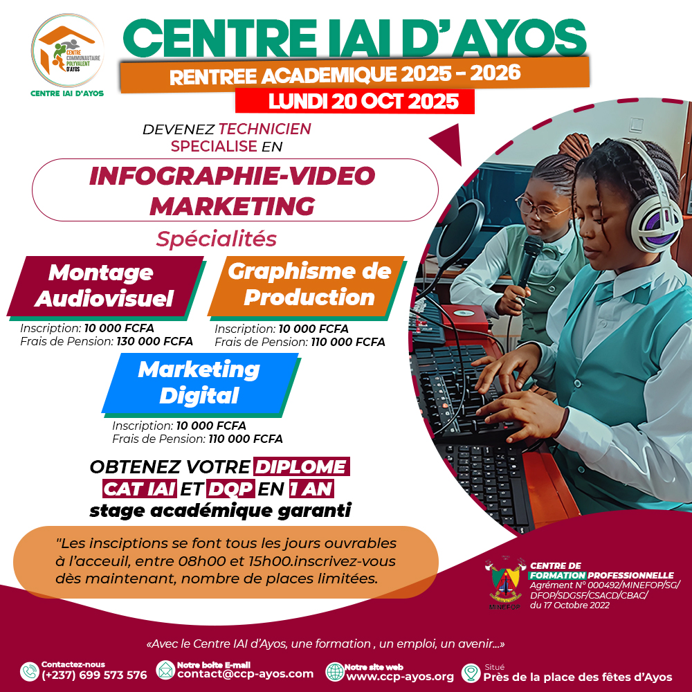BN: Les inscriptions se font tous les jours ouvrables à l’accueil du CCP–Ayos, entre 8h00 et 15h00.